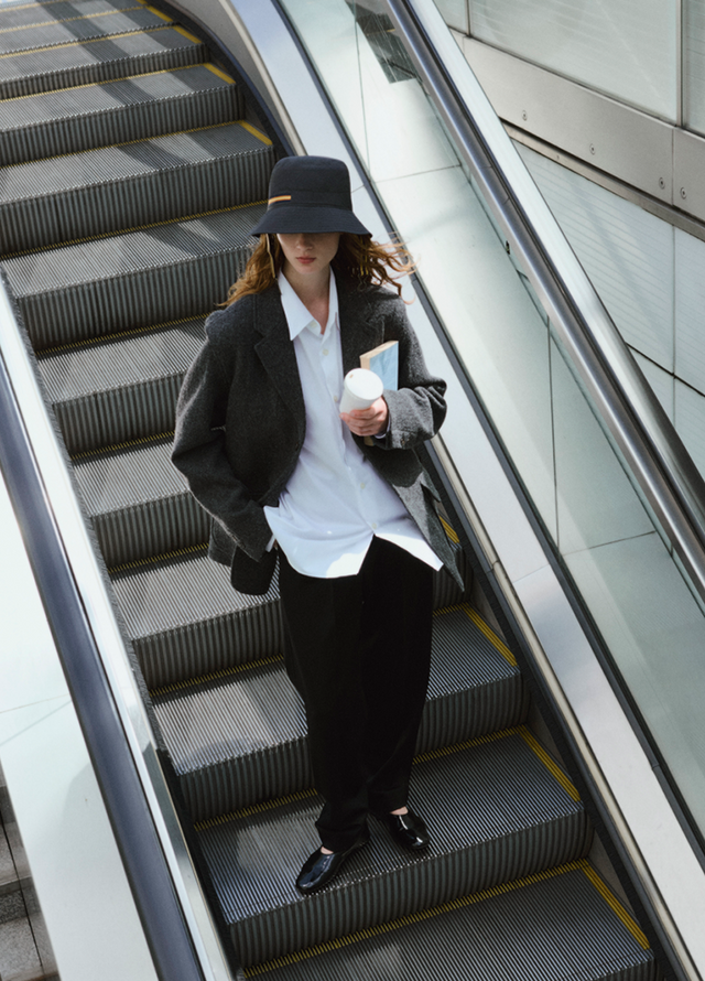 La emblemática gabardina Pradel, con su amplio volumen, se presenta en dos tonos: masilla y antracita. A su alrededor, se perfila una nueva