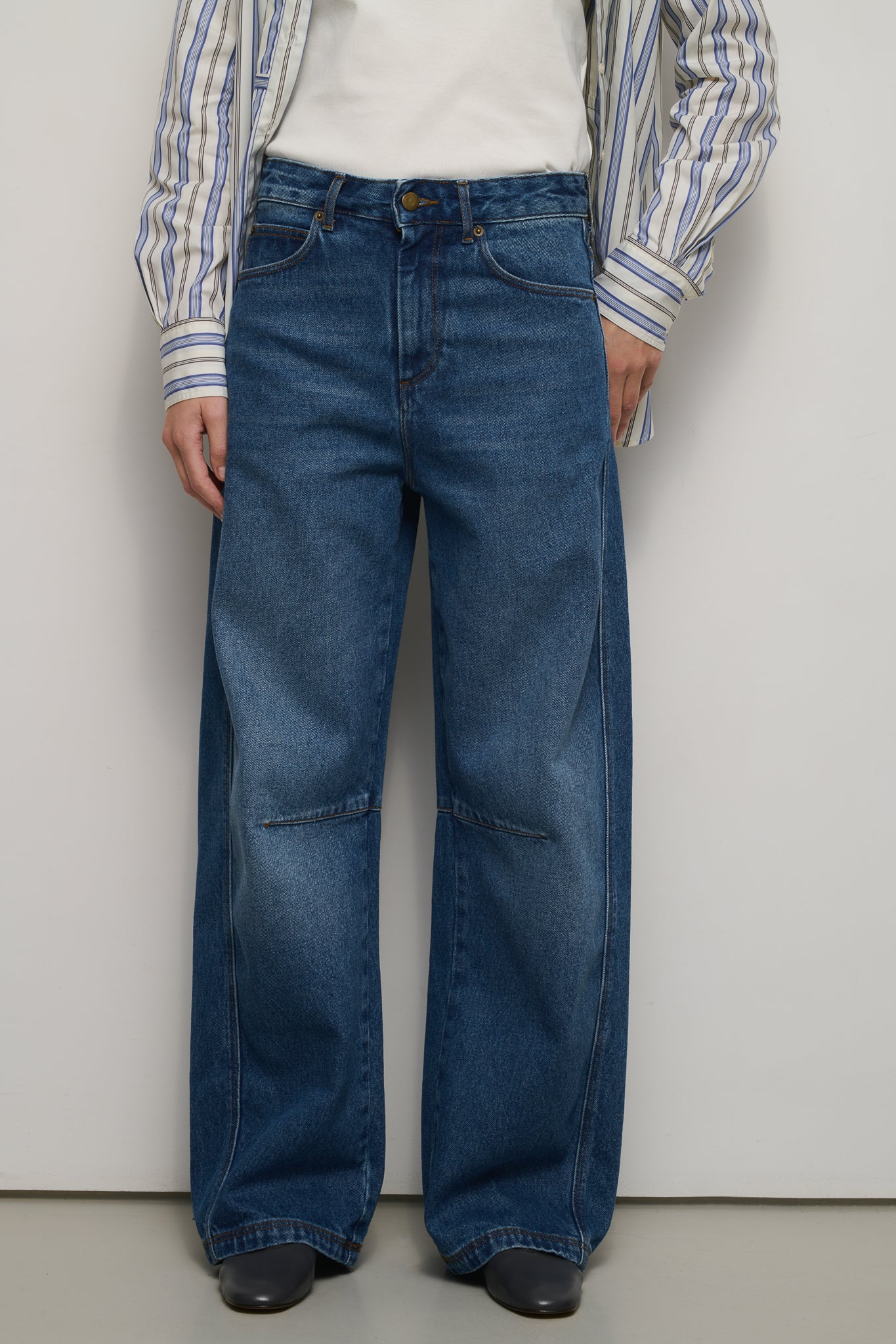 ELIOTT es un pantalón de tela vaquera de corte amplio y femenino. El diseño curvo de la pierna, que estiliza la cintura, y su tono azul ofrecen un estilo que combina lo casual con la elegancia.