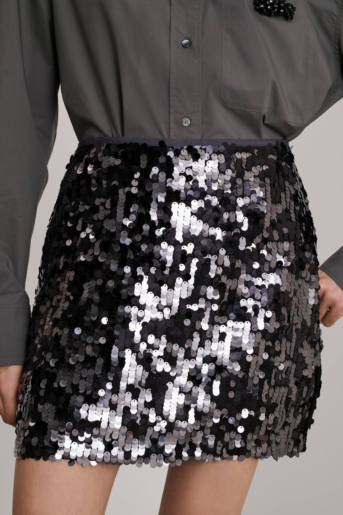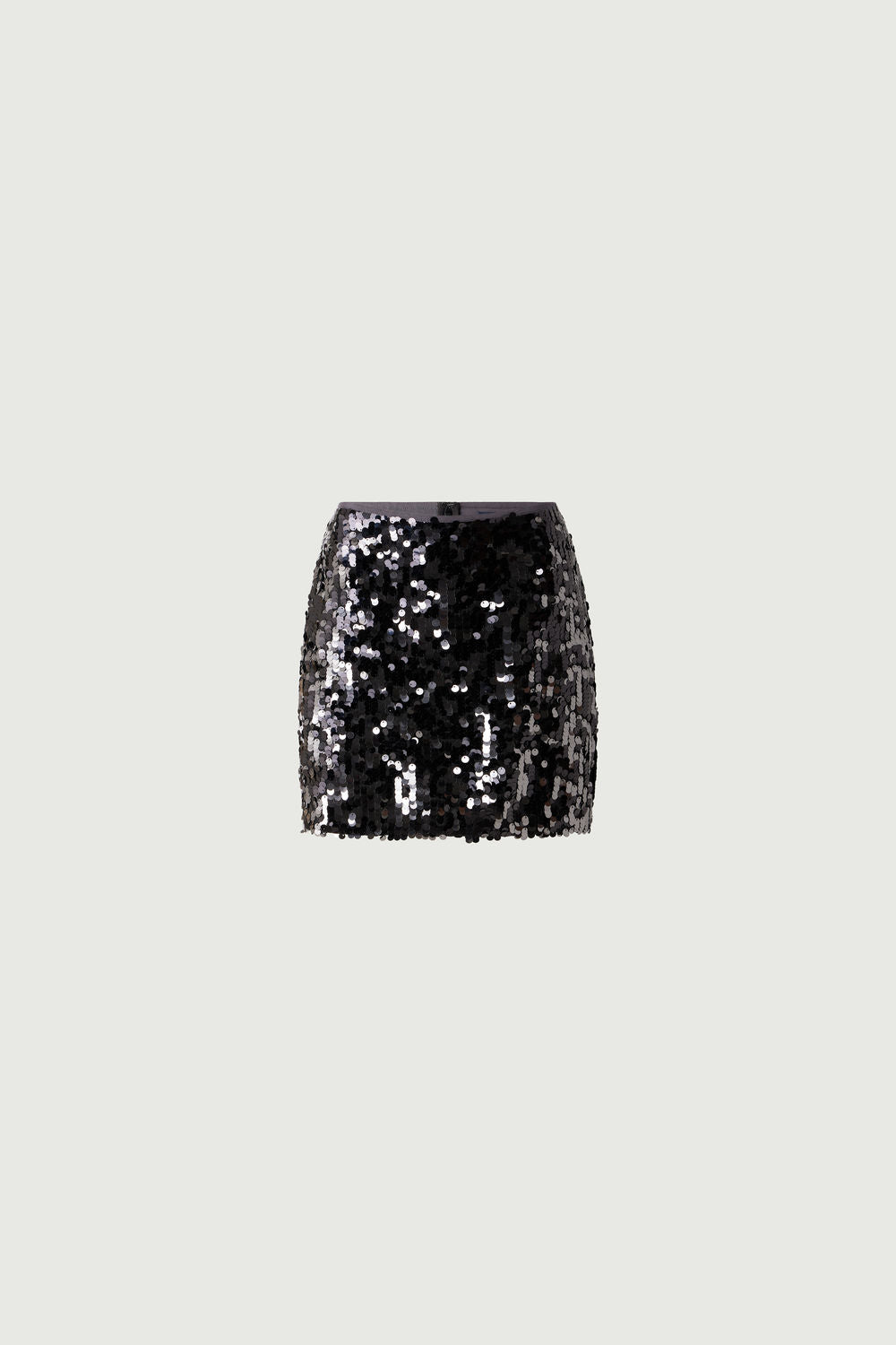 ROBBIE es una falda corta confeccionada con un tejido de lentejuelas. Los tonos azul y gris marengo se combinan para crear una tonalidad única que realzará tus conjuntos de noche. Totalmente forrada, se ciñe a las caderas. El corte es corto y recto.