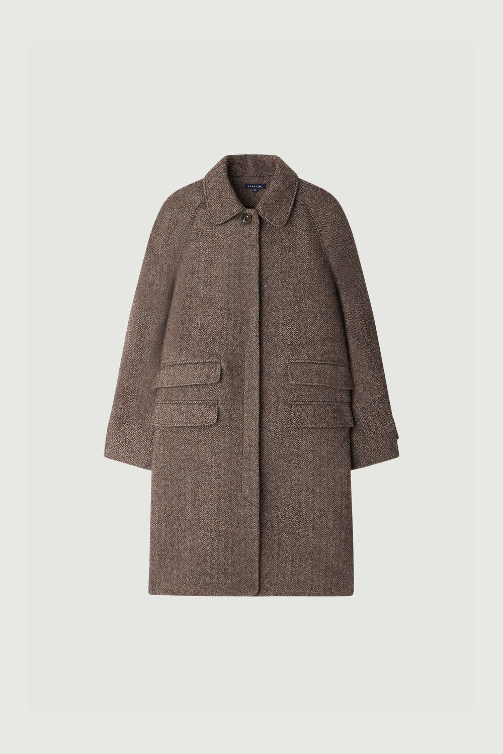 SIMBA es un abrigo de lana en espiga. Equipado con mangas raglán con codo, combina confort y elegancia. El cuello clásico y la tapeta de botones oculta añaden un toque de refinamiento. Con sus cuatro bolsillos con solapa prácticos y las trabillas abotonadas en los puños, SIMBA en lana abotonada es a la vez funcional y sofisticado.