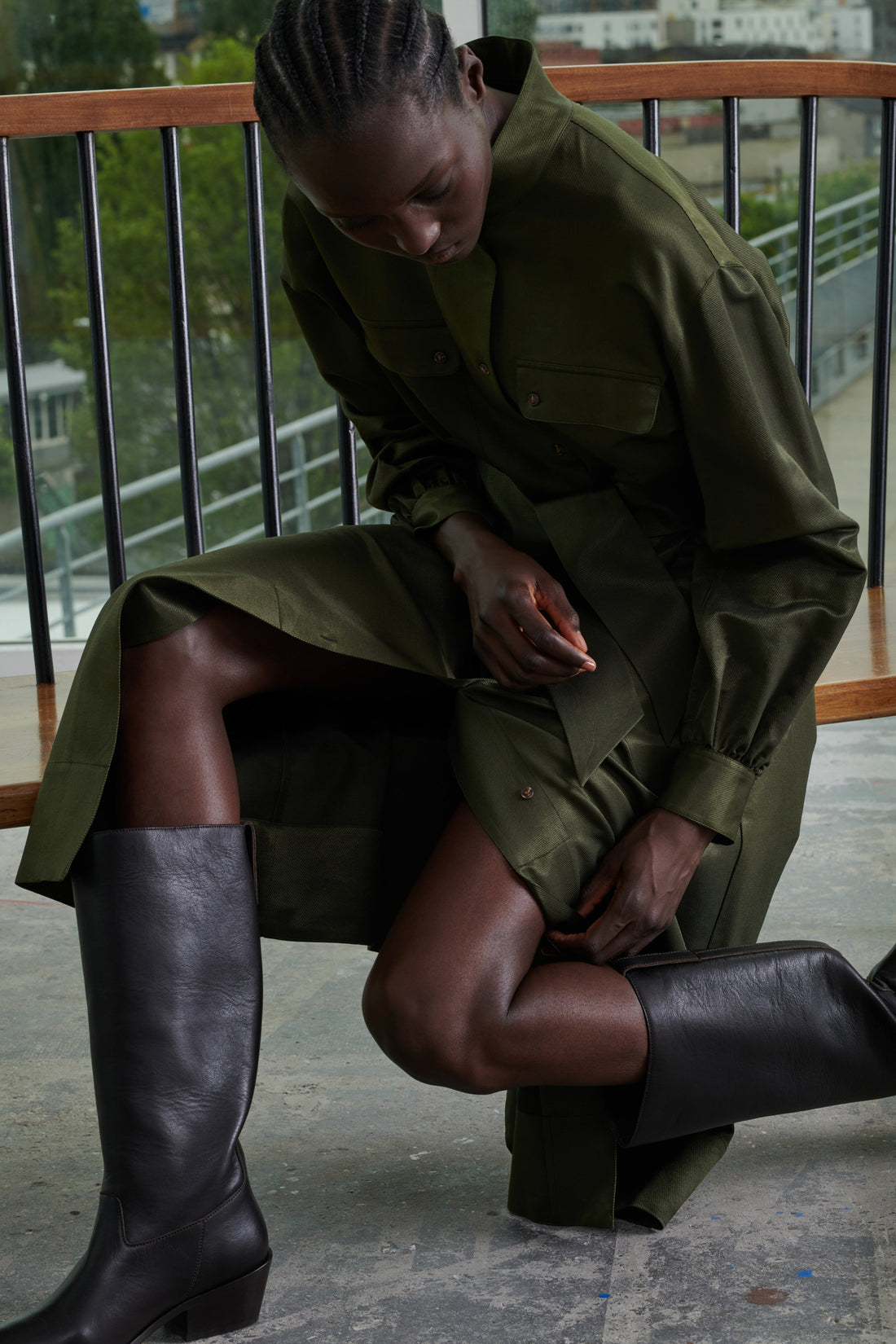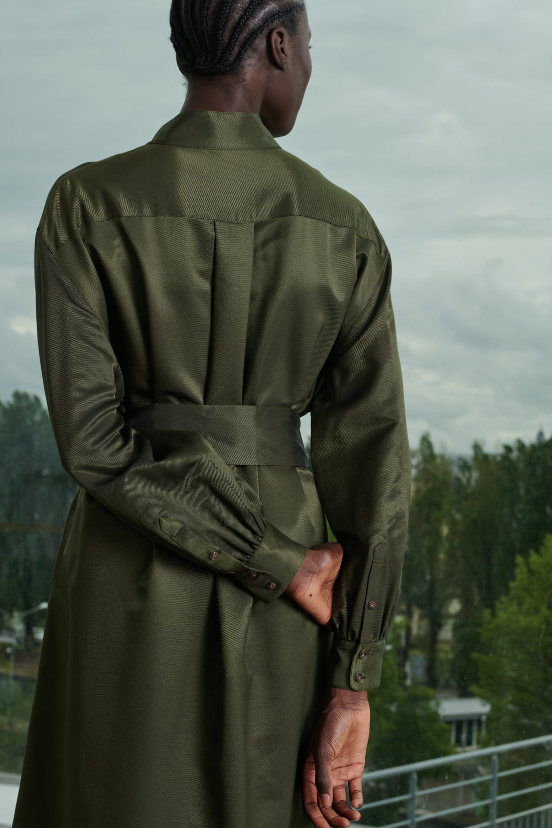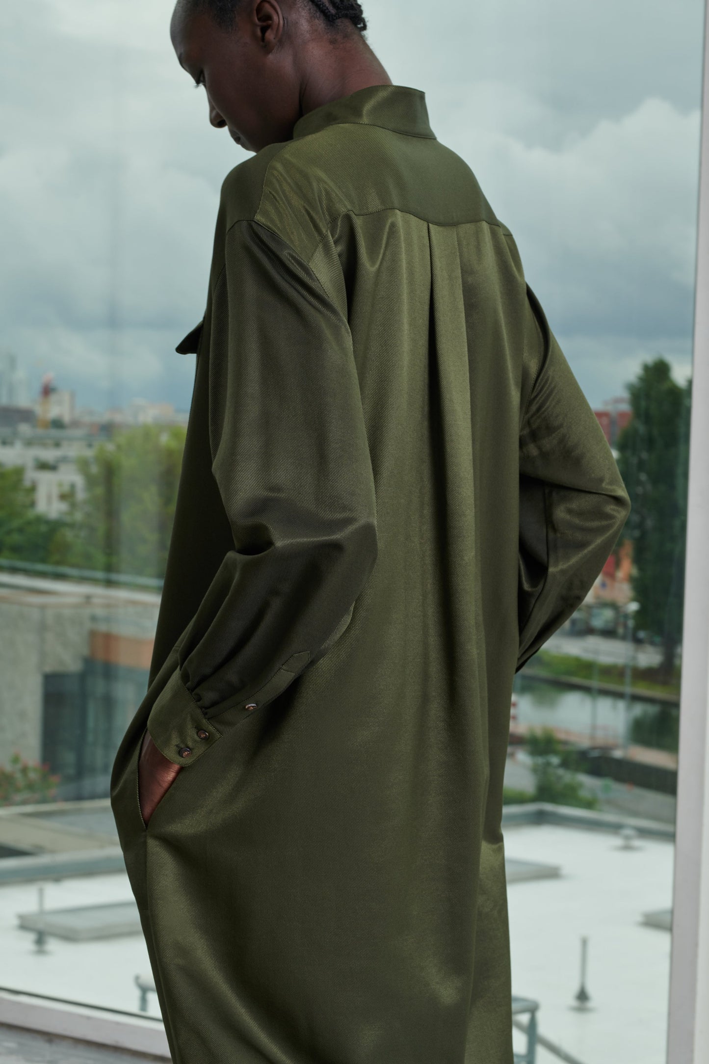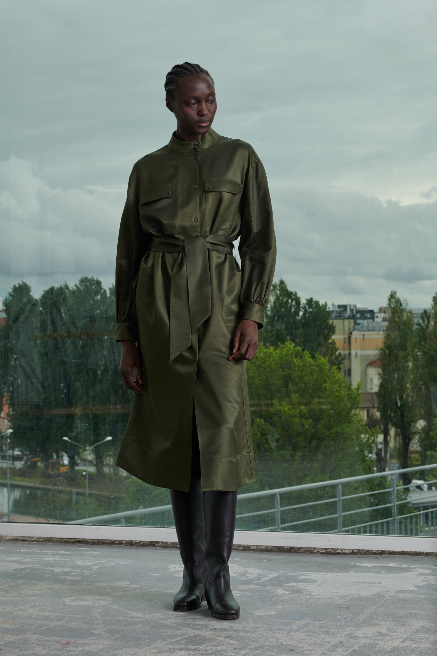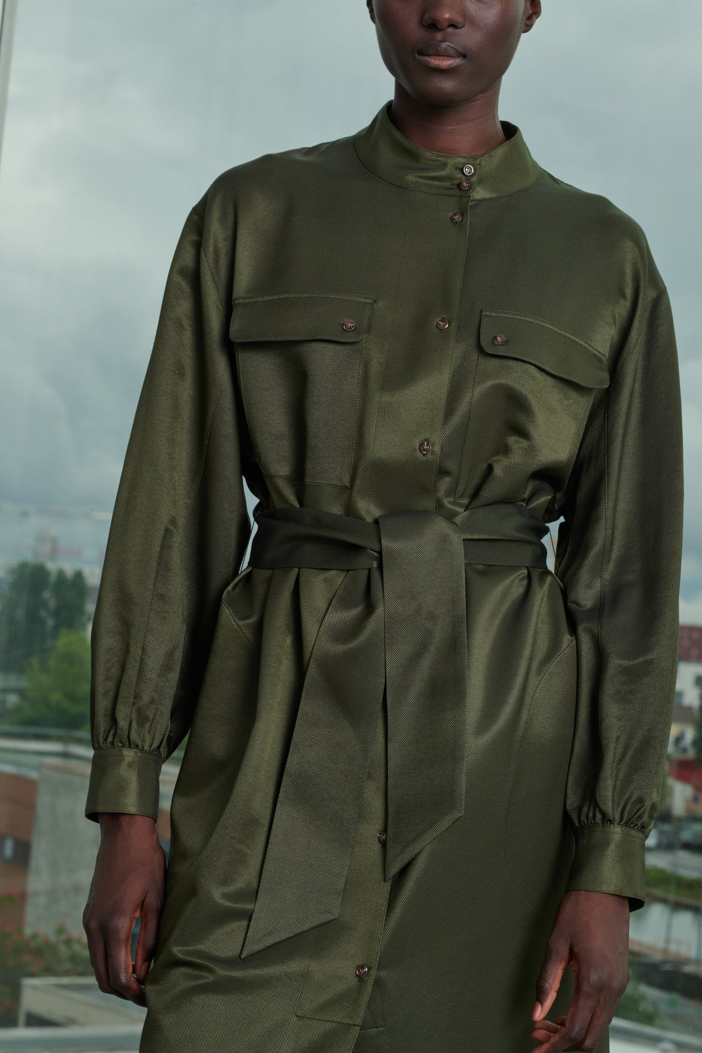 Vestido con cuello abotonado de sarga de seda estampada caqui